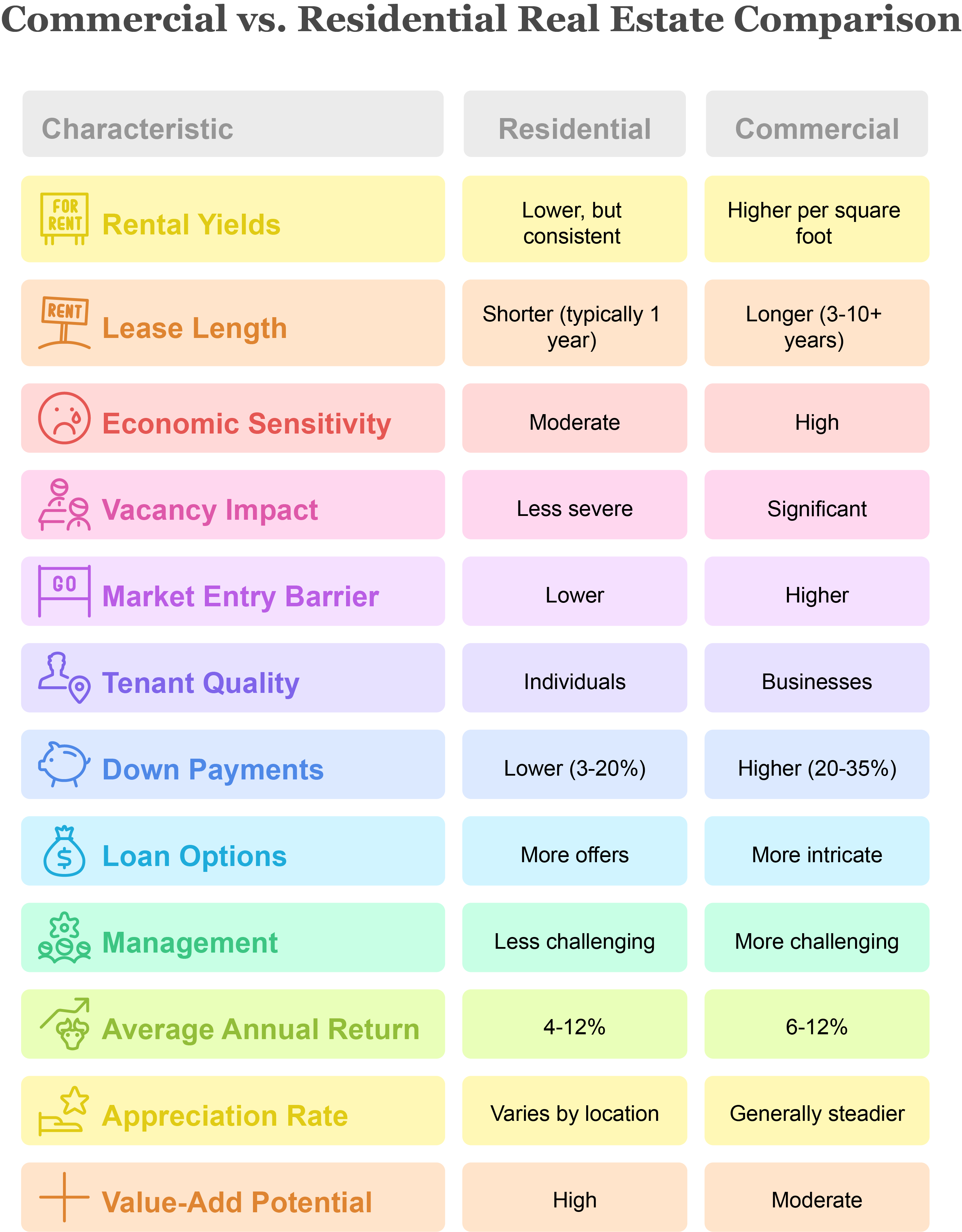 - Residential properties, on the other hand, typically generate constant long-term returns through moderate and steady property value growth.